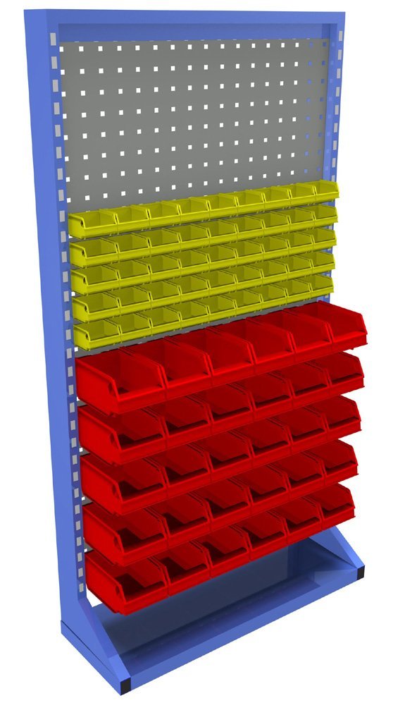 Stacionárný jednostranný panel s vybavením. Konštrukcia stojanu je tvorená robustným rámom s kovovými perforanými stenami pre zavesenie plastových boxov a držiakov náradia. Rám je lakovaný odolnou práškovou farbou, perforované panely sú pozinkované alebo lakované odolnou práškovou farbou.