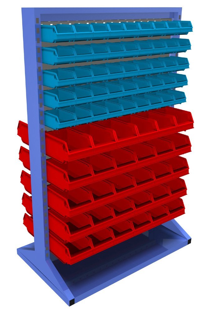 Stacionárný obojstranný panel s vybavením. Konštrukcia stojanu je tvorená robustným rámom s kovovými perforanými stenami pre zavesenie plastových boxov. Rám je lakovaný odolnou práškovou farbou, perforované panely sú pozinkované alebo lakované odolnou práškovou farbou.