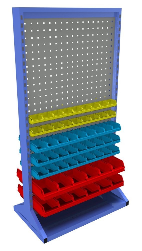 Stacionárne obojstranný panel s vybavením. Konštrukcia stojanu je tvorená robustným rámom s kovovými perforanými stenami pre zavesenie plastových boxov. Rám je lakovaný odolnou práškovou farbou, perforované panely sú pozinkované alebo lakované odolnou práškovou farbou.