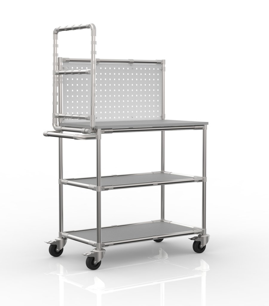 Stôl so sklopkou vyrobený z rúrkového stavebnicového systému. Súčasťou stola je sklopná konštrukcia na upevnenie odpadkových vriec, pracovná laminovaná doska s hrúbkou 18 mm, dve police s akyboardom hrúbky 10 mm, štyri otočné kolieska s brzdou s priemerom 100 mm, perfopanel na zavesenie náradia alebo úložných boxov. Nosnosť police je 50 kg, nosnosť pracovnej dosky je 100 kg, celková nosnosť je 200 kg. Rozmery 1335 x 1029 x 498 mm, rozmery po zložení držiaka 1335 x 1595 x 498 mm.