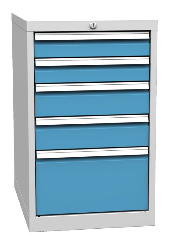 Päťzásuvkový kontajner pracovného stolu, šírka 500, výška 810, hĺbka 700 mm. 2x zásuvka 90, 2x 120, 1x 240 mm. Farba korpusu RAL 7035 svetlosivá.