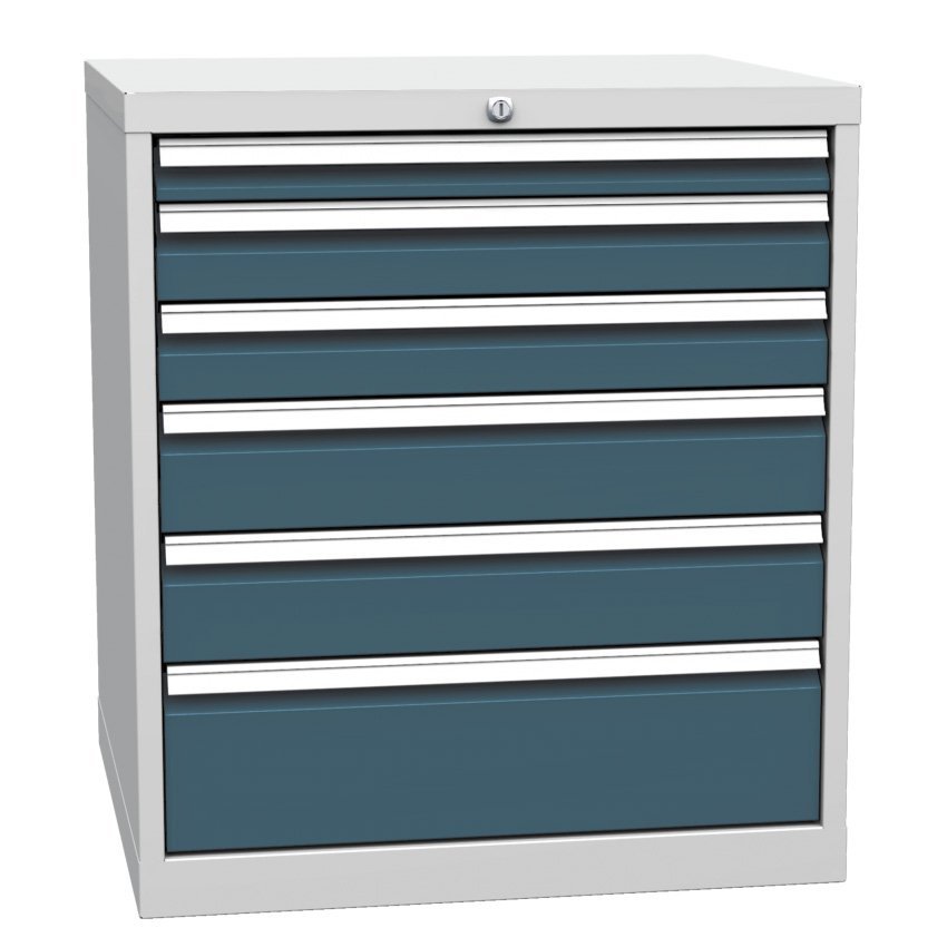Päťzásuvkový kontajner pracovného stolu, šírka 720, výška 810, hĺbka 700 mm. 1x zásuvka 60, 2x 90, 2x 120, 1x 180 mm. Farba korpusu RAL 7035 svetlosivá.