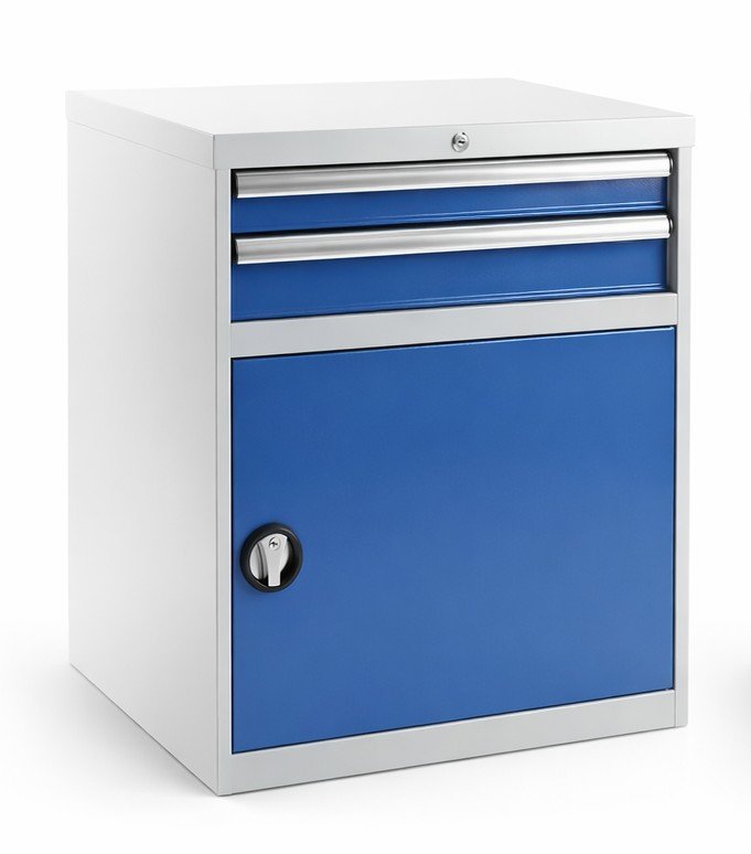 Dvojzásuvkový kontajner pracovného stola s dvierkami, šírka 717 mm, výška 800 mm, hĺbka 727 mm, 1× zásuvka 75 mm, 1× 100 mm, 1× polica. Farba korpusu RAL 7035 svetlosivá, farba zásuviek RAL 5012 modrá.
