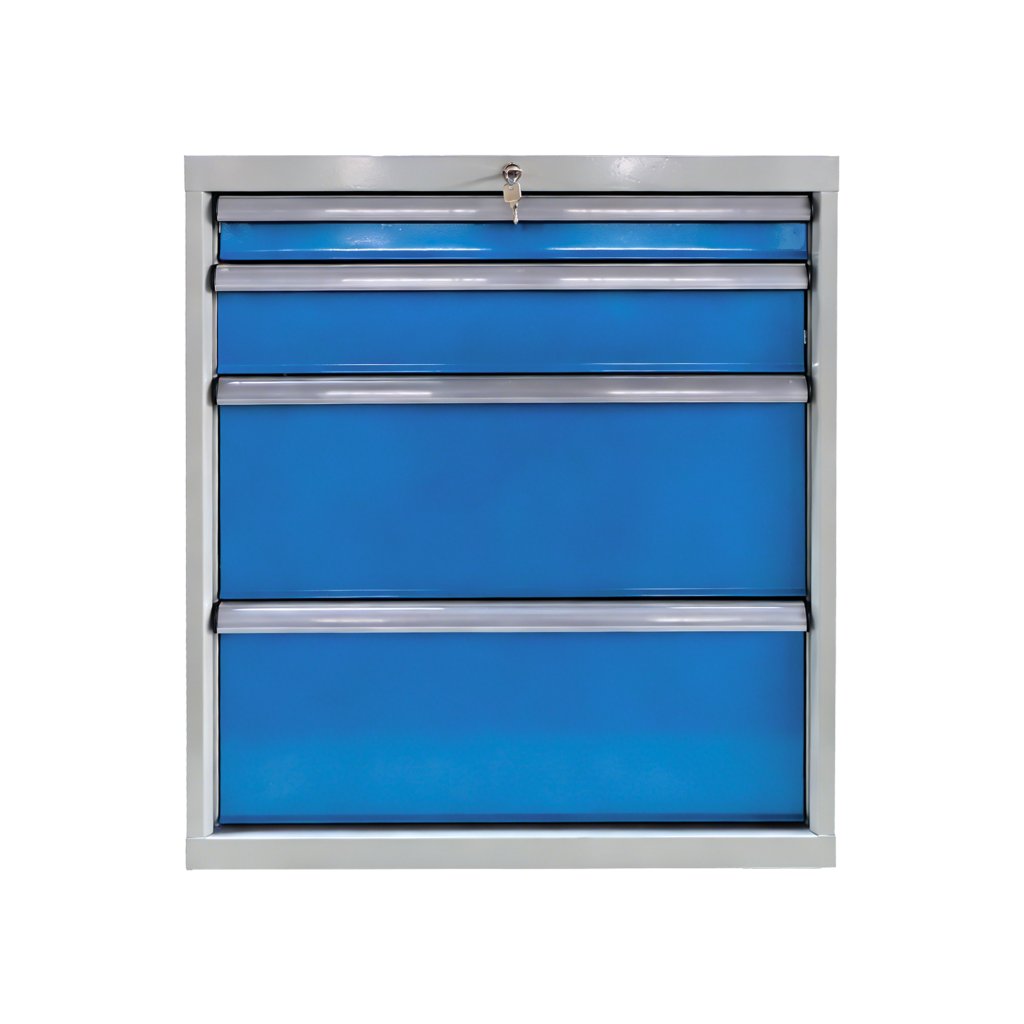 Štvorzásuvkový kontajner pracovného stola, šírka 717 mm, výška 800 mm, hĺbka 727 mm, 1× zásuvka 75, 1x 125, 2x 250 mm. Farba korpusu RAL 7035 svetlosivá, farba zásuviek RAL 5012 modrá.