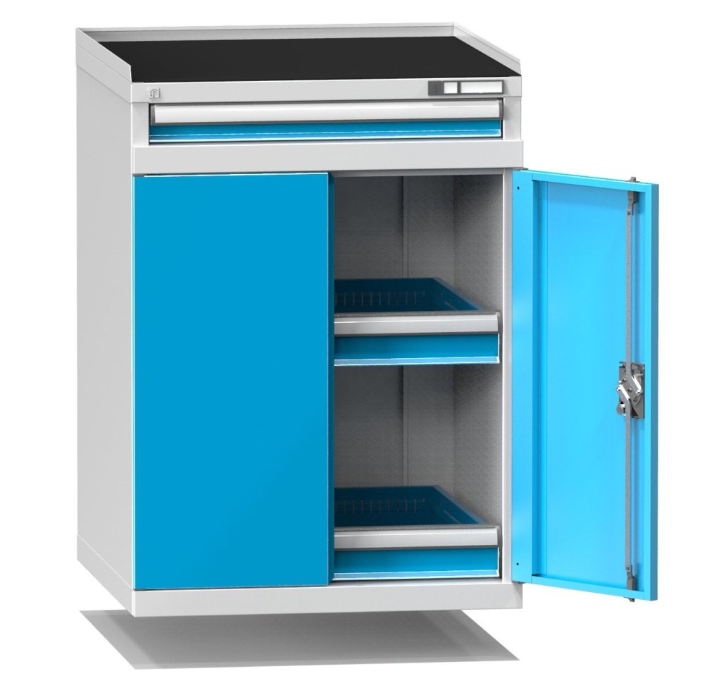 Strojná skriňa, zásuvky šírka 612 x hĺbka 612 mm (36 x 36D), zvýšená hrana 20mm, gumová podložka, 3x zásuvka – 1x 75 E vonkajšia, 2x zásuvka 100E vnútri za dvierkami, dvierka, nosnosť 700 kg.
