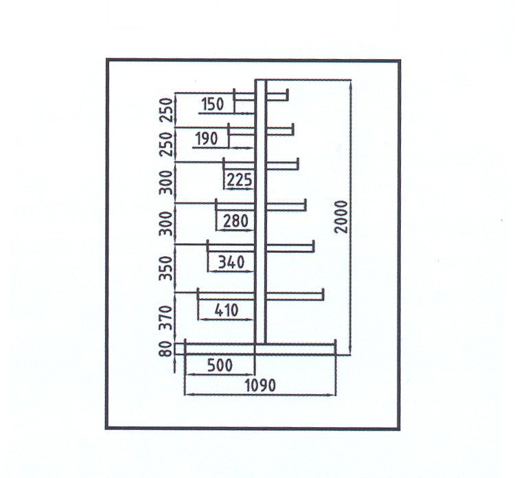 Konzolový regál ATLAS ST obojstranný s rozdielnou dĺžkou ramien. Počet ramien 2 x 6 na jednu stojinu, počet stojin 4. Výška regálu celý popis a parametre