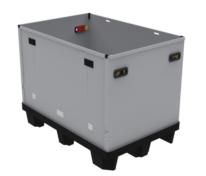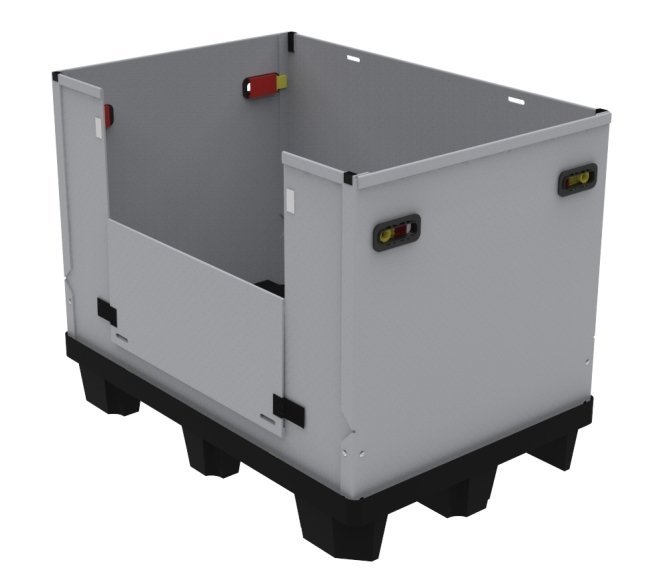 Vyznačuje sa maximálnym úžitkovým objemom v rozloženom stave a minimálnou veľkosťou v zloženom stave. Ideálne na manipuláciu, skladovanie a systém vratného balenia. Výška 995 x šírka 1215 x hĺbka 1015 mm. Dvierka na jednej strane.