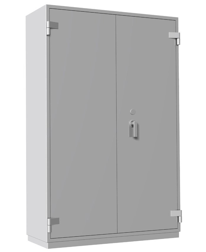 Trezorová skriňa so zvýšenou odolnosťou proti ohňu dvojdverová, 4 prestaviteľné police, zamykanie na trezorový kľúč alebo el. kód. Bezpečnostná trieda 1, certifikát NBÚ Tajné. Výška 1950 x šírka 1260 x hĺbka 550 mm, hmotnosť 480 kg, barva svetlosivá RAL 7035. Doprava hradená podľa miesta dodania.