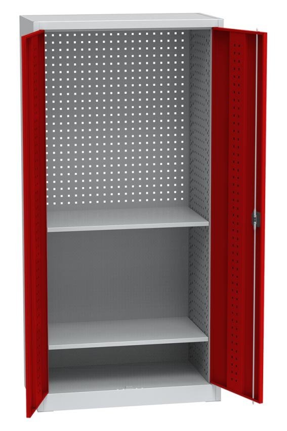 Dvojdverová kovová skriňa s 2 policami a vnútornou DVB perforáciou pre inštaláciu zásuviek DUS_11_Z10. Rozmery výška 1950 x šírka celý popis a parametre