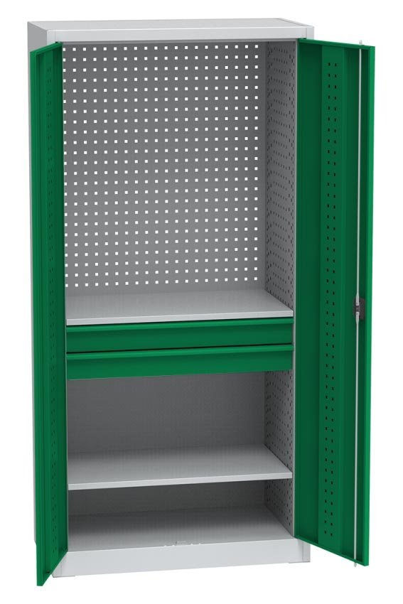 Dvojdverová kovová skriňa s 2 policami, 2 zásuvkami a vnútornou DVB perforáciou pre inštaláciu zásuviek DUS_11_Z10. Rozmery výška 1950 x šírka 950 x hĺbka 500 mm. Zamykanie na cylindrický rozvorový zámok. Farba korpusu svetlosivá.