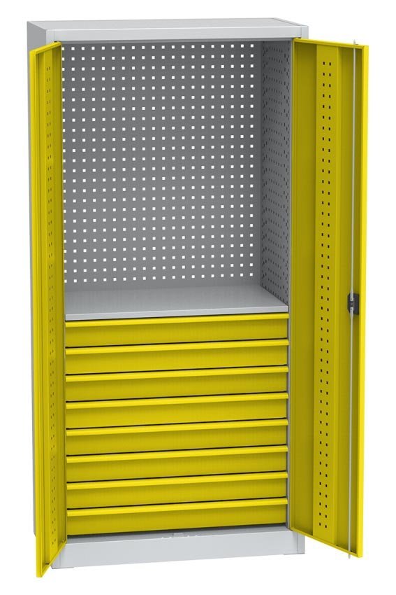 Dvojdverová kovová skriňa s 2 policami, 2 zásuvkami a vnútornou DVB perforáciou pre inštaláciu zásuviek DUS_11_Z10. Rozmery výška 1950 x šírka 950 x hĺbka 500 mm. Zamykanie na cylindrický rozvorový zámok. Farba korpusu svetlosivá.