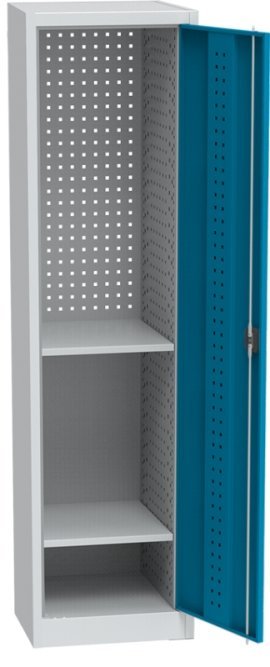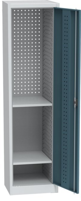 Jednodverová kovová skriňa s 2 policami a vnútornou DVB perforáciou pre inštaláciu zásuviek DUS_13_Z10. Rozmery výška 1950 x šírka celý popis a parametre