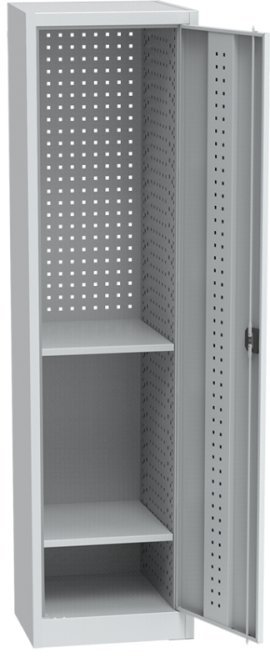 Jednodverová kovová skriňa s 2 policami a vnútornou DVB perforáciou pre inštaláciu zásuviek DUS_13_Z10. Rozmery výška 1950 x šírka 505 x hĺbka 500 mm. Zamykanie na cylindrický rozvorový zámok. Farba korpusu svetlosivá.