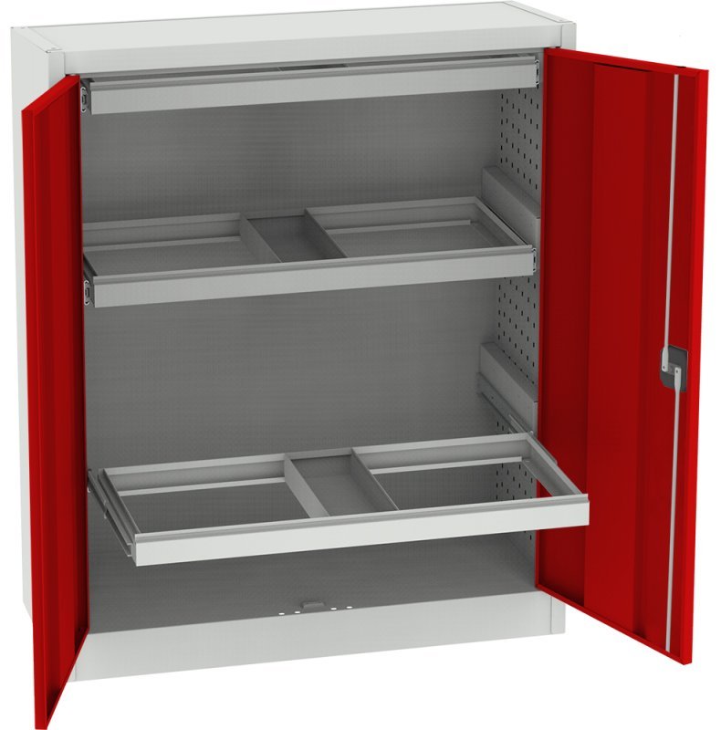 Kovová skriňa s posuvnými dverami, výška 1950 x šírka 950 x hĺbka 400 mm, 4x nastaviteľná polica. Posuvné dvere so zámkom v niekoľkých farebných odtieňoch, korpus svetlosivý RAL 7035.