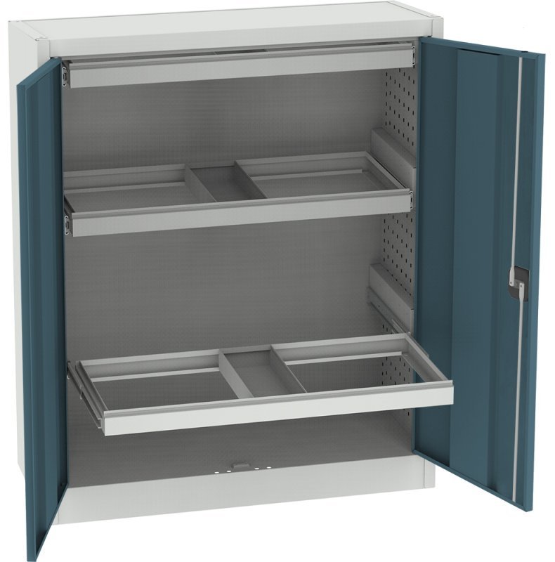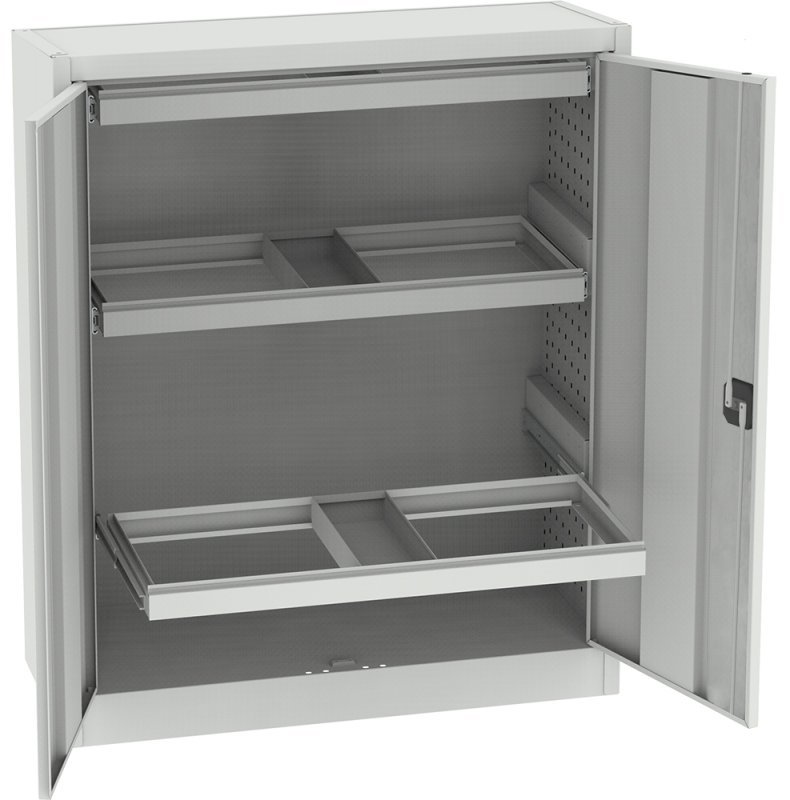 Dvojdverová kovová skriňa s tromi výsuvnými rámami. Rozmery výška 1150 x šírka 950 x hĺbka 400 mm. Zamykanie na cylindrický rozvorový zámok. Farba korpusu svetlosivá.