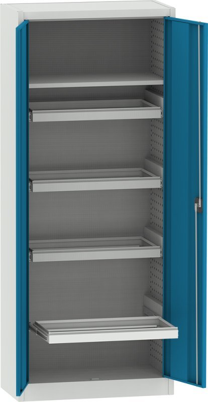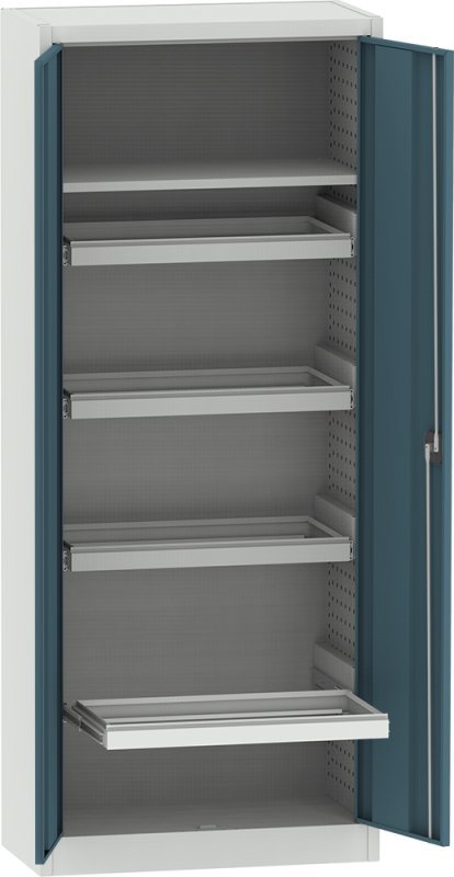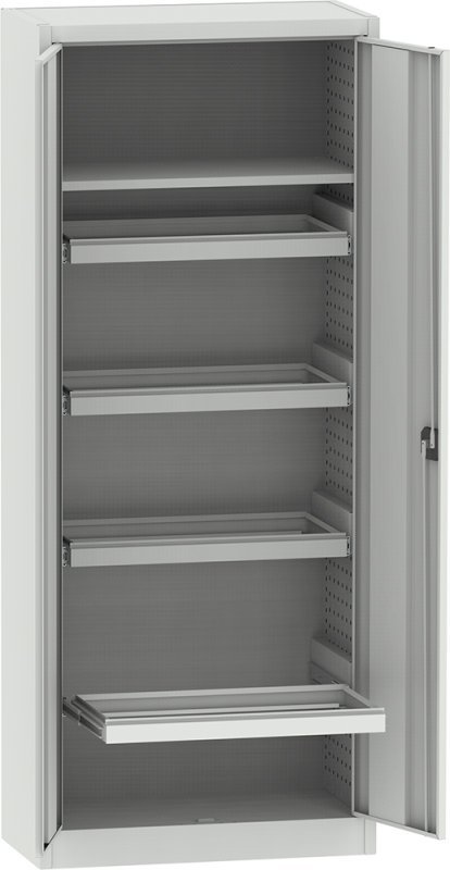Dvojdverová kovová skriňa so štyrmi výsuvnými rámami a jednou policou. Rozmery výška 1950 x šírka 800 x hĺbka 400 mm. Zamykanie na cylindrický rozvorový zámok. Farba korpusu svetlosivá.