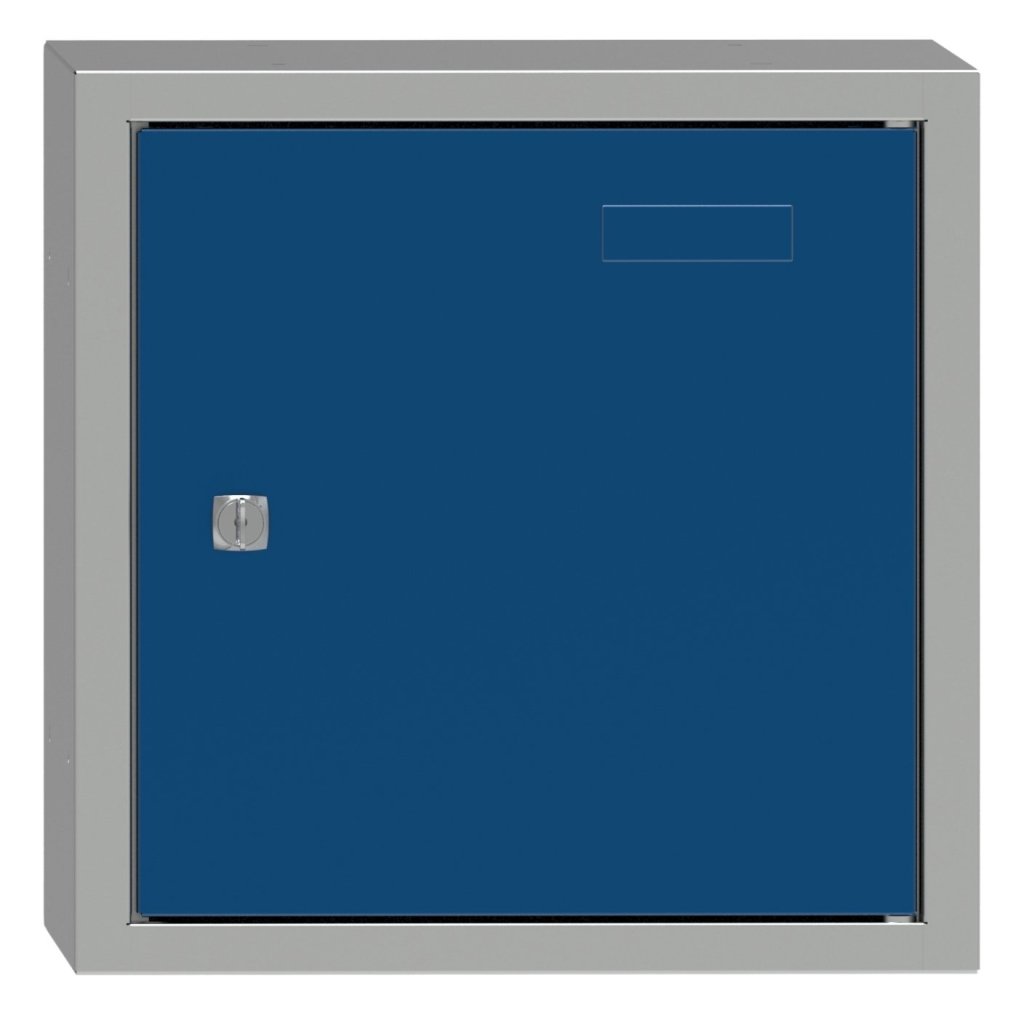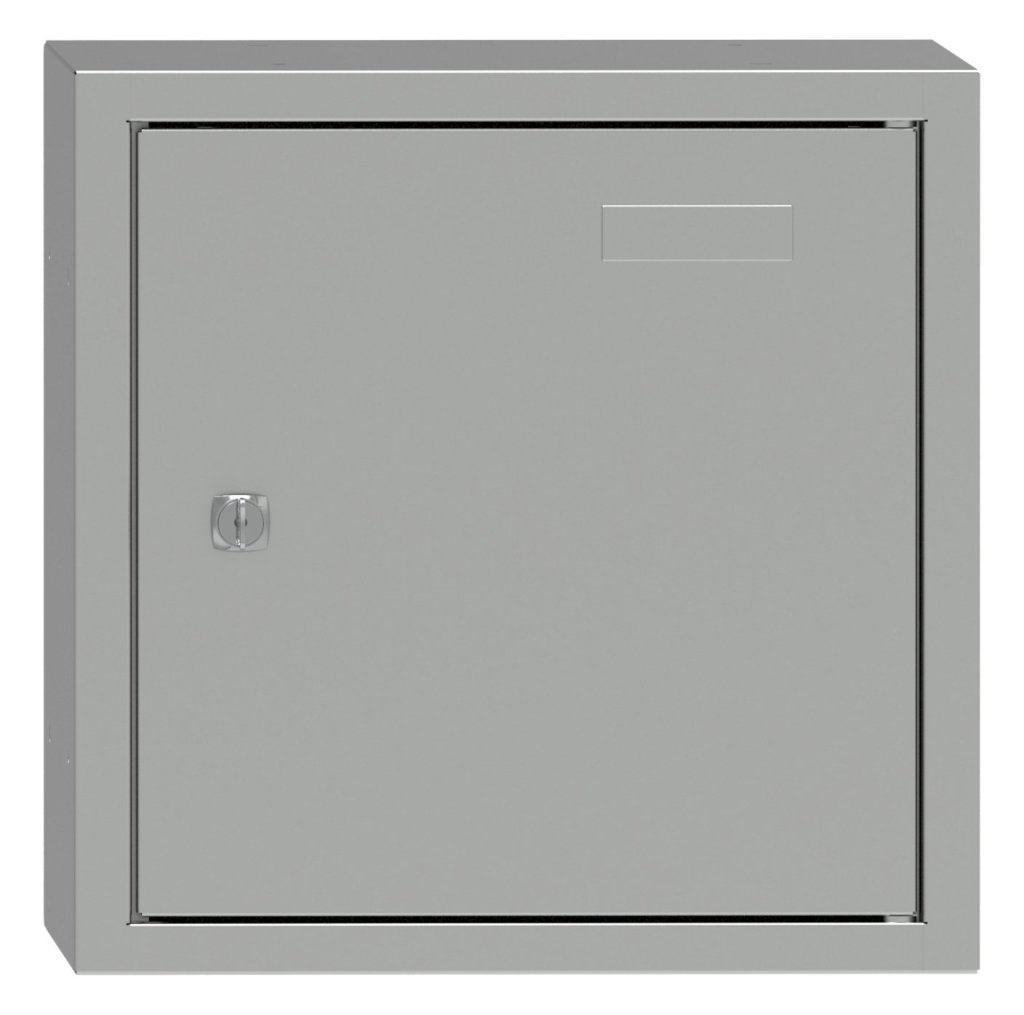 Jednodverová uzatvárateľná kocka. Výška 350, šírka 350, hĺbka 426 mm. Farba korpusu RAL 7035, svetlosivá.