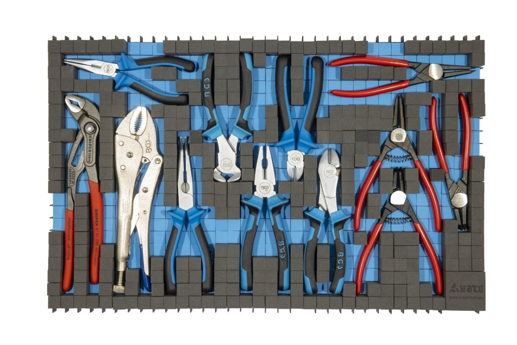 4dielna sada klieští pre mechaniky uložená v plastovom modulu. Veľkosť 185 x 420 mm.