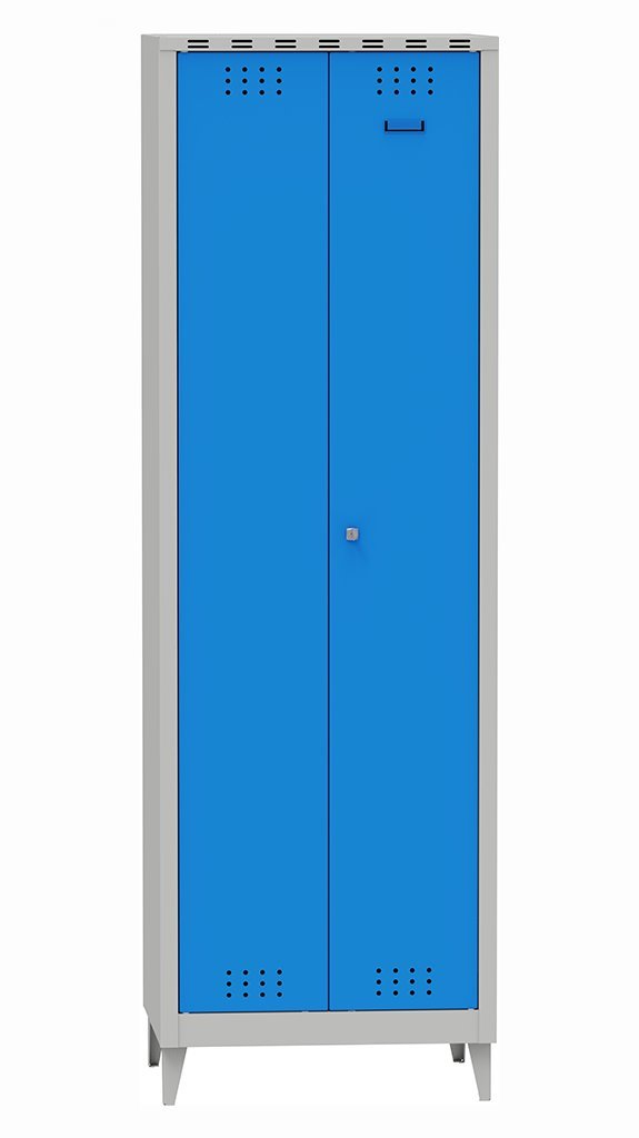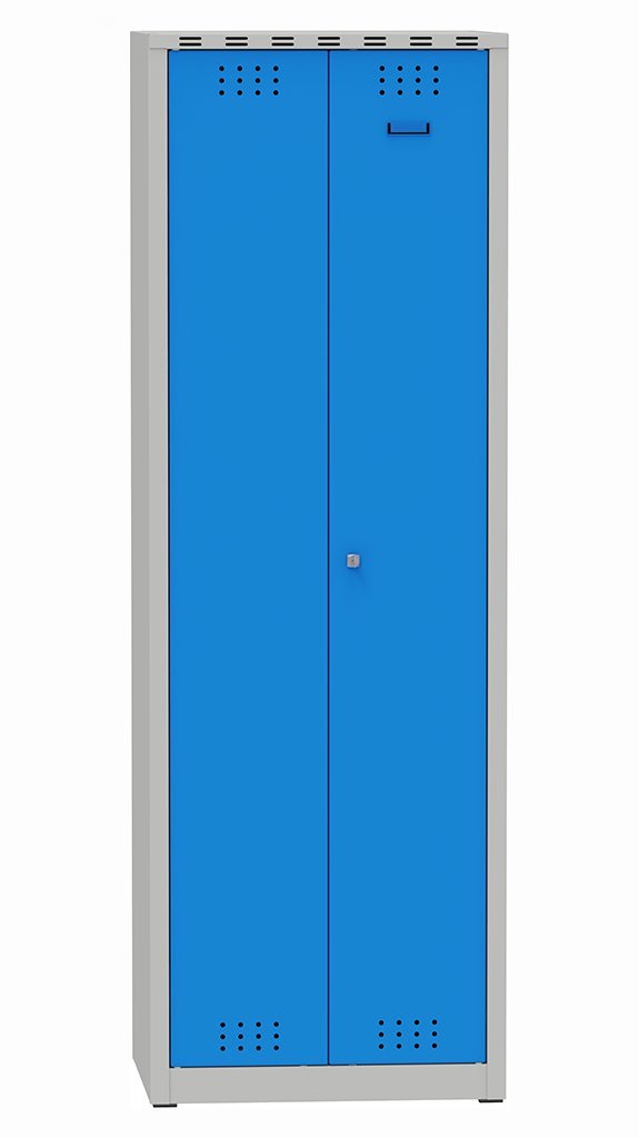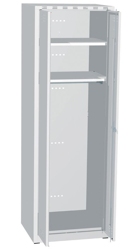 Veľkoobjemová šatníková skriňa so spoločnými dverami, výška 1800 x šírka 600 x hĺbka 500 mm. Skriňa je vybavená 2x policou, tyčou na ramienka s posuvnými háčikmi, farba korpusu RAL 7035 svetlo šedá. Zamykanie rozvorovým zámkom.