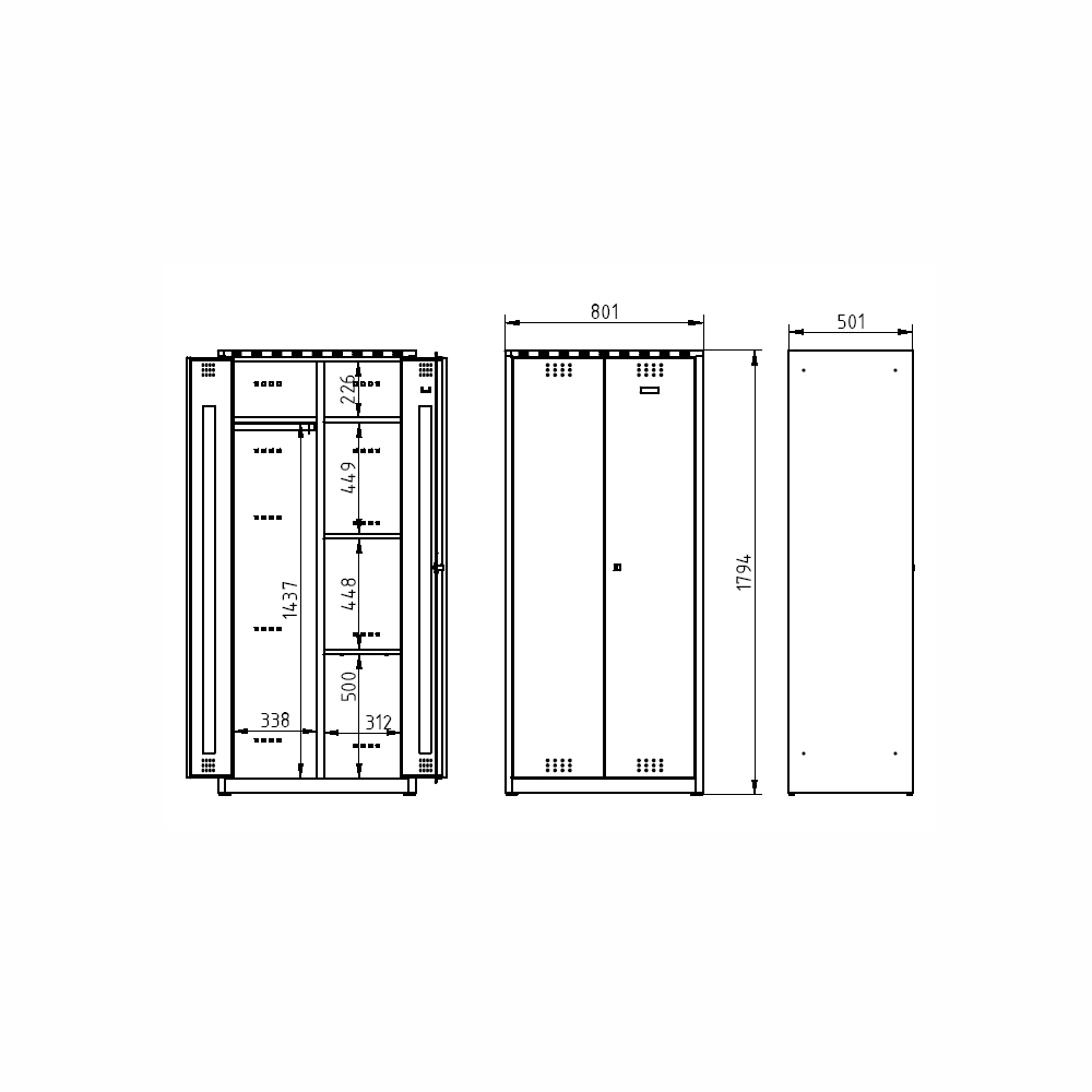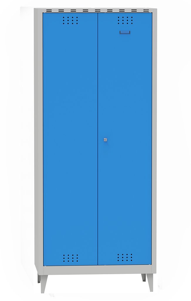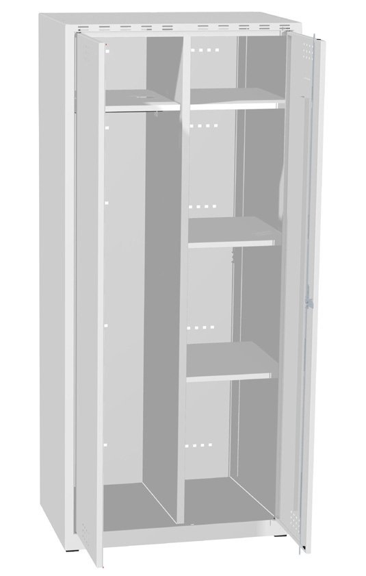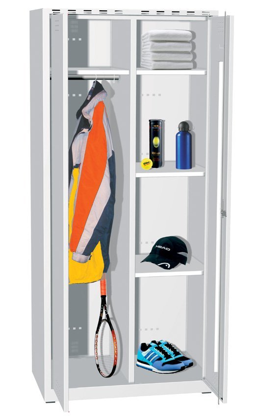 Veľkoobjemová šatníková skriňa so spoločnými dverami, výška 1800 x šírka 800 x hĺbka 500 mm. Ľavá polovica skrine je vybavená policou, tyčou na ramienka s posuvnými háčikmi, pravá polovica štyrmi policami. Farba koprusu RAL 7035 svetlo šedá.