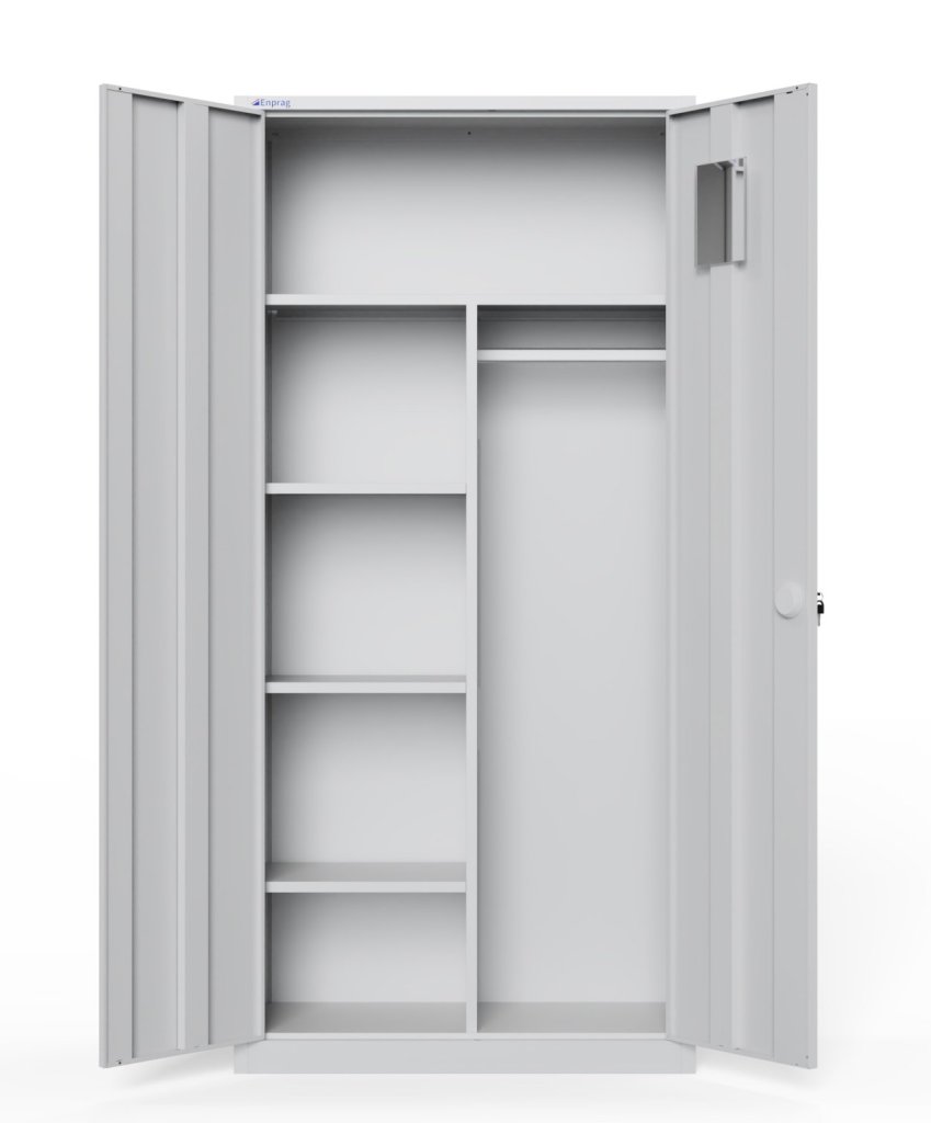 Dvojdverová demontovaná skriňa z oceľového plechu hrúbky 0,6 mm. Výška 1850 x šírka 900 x hĺbka 390 mm, 4x polica, cylindrický rozvorový zámok s dvoma kľúčmi. Povrchová úprava šedou práškovou farbou RAL 7047.
