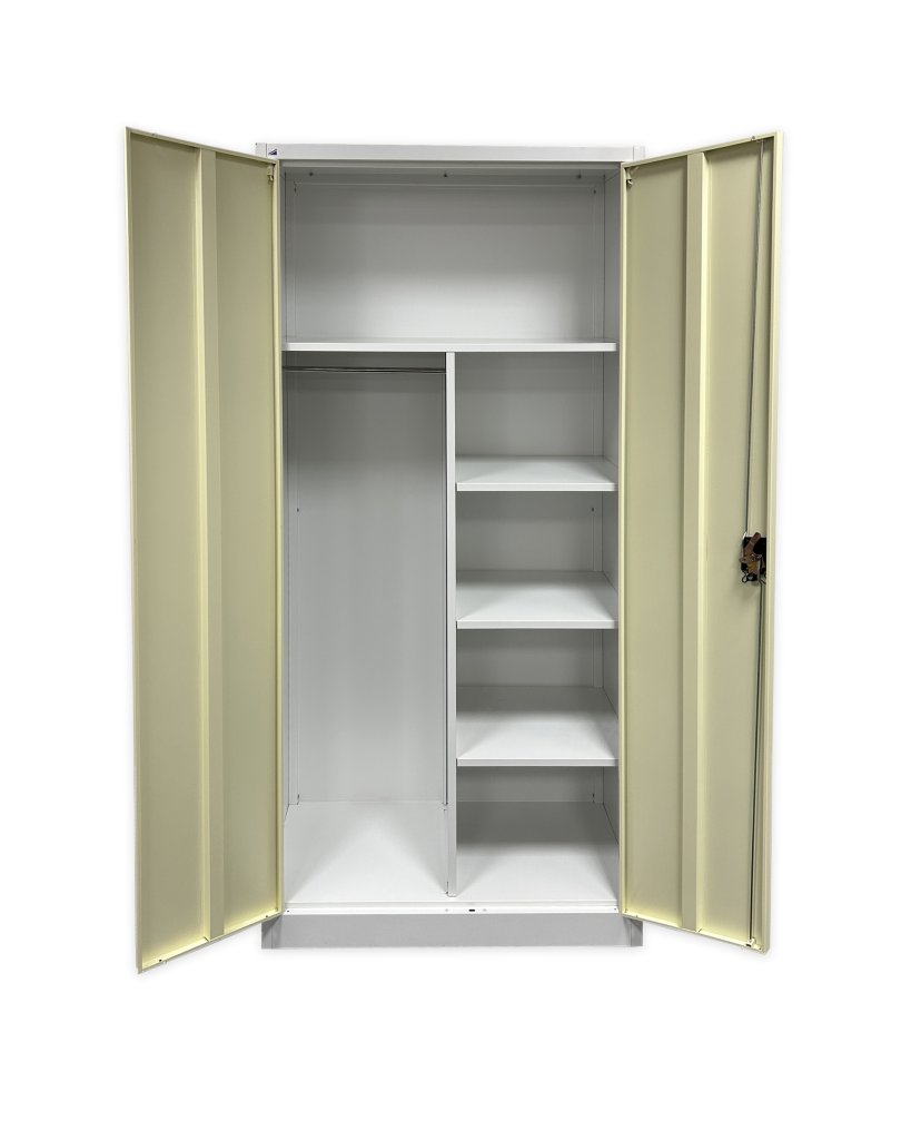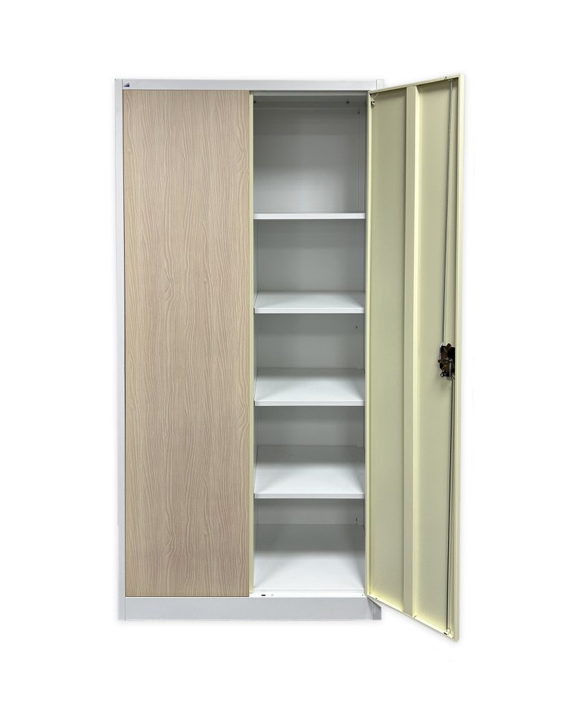 Dvojdverová demontovaná skriňa z oceľového plechu hrúbky 0,6 mm. Výška 1950 x šírka 900 x hĺbka 450 mm, 4x polica, cylindrický rozvorový zámok s dvoma kľúčmi. Povrchová úprava práškovou farbou biela RAL 9003/imitácia svetlé drevo.