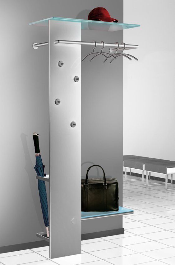 Oceľová vešiaková stena v striebornej farbe. Polica na klobúky z priehľadného bezpečnostného skla, 5 ramienok, 6 háčikov v cene. Výška 1700 mm, šírka 600 mm, hĺbka (bez ramienok) 330 mm.