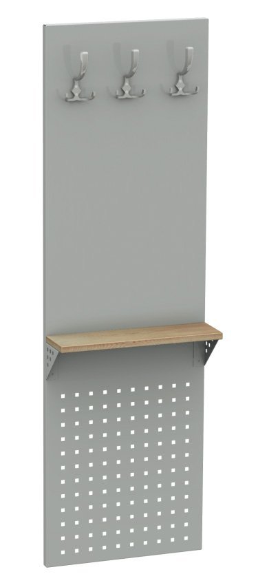 Viacúčelová vešiaková stena Kent. Vysoká kapacita vďaka štyrom kovovým ramienkam na odevy a štyrom silným magnetickým háčikom na kovovom panelu. Súčasťou vešiaku je i odkladacia polička na klobúky a na tašky zo satinovaného bezpečnostného skla hrúbky 8 mm. Povrchová úprava práškovým lakom vo farbe striebornej RAL 9006. Držiak na dáždniky nie je súčasťou steny - možno dokúpiť.