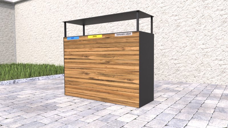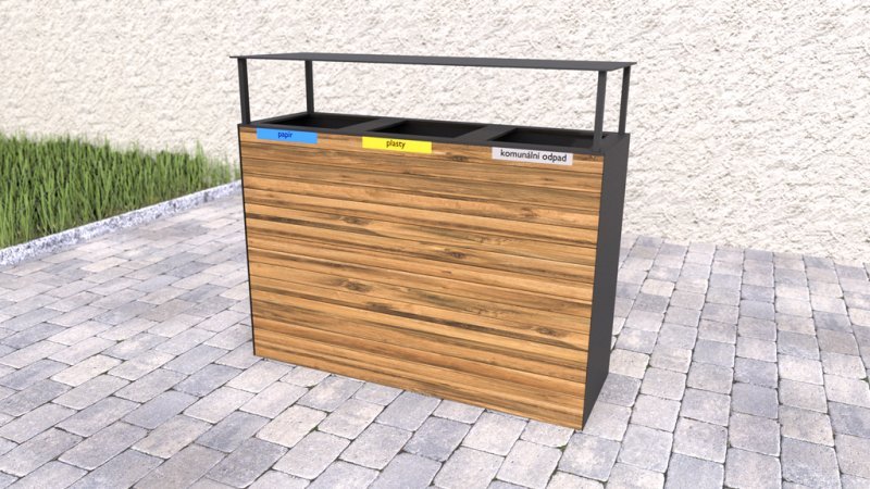 Vonkajší odpadkový kôš na triedený odpad s dreveným plášťom a strieškou. Drevené laty sú 3x ošetrené lazúrou, ktorá chráni vonkajší nábytok pred UV žiarením a poveternostnými vplyvmi. Kôš má vyberateľné pozinkované vložky na odpad s objemom 65 l. Hmotnosť 80 kg.