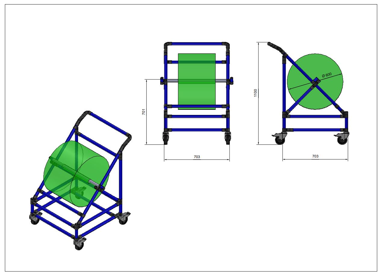 Vozík na cievky je typ ručného vozíka, ktorý je určený na skladovanie a prepravu veľkých cievok s drôtmi a káblami. Kolieska sú opatrené brzdami, ktoré zabraňujú samovoľnému pohybu pri nepoužívaní vozíka. Farba konštrukcie voliteľná podľa dostupných rúrok na webe.