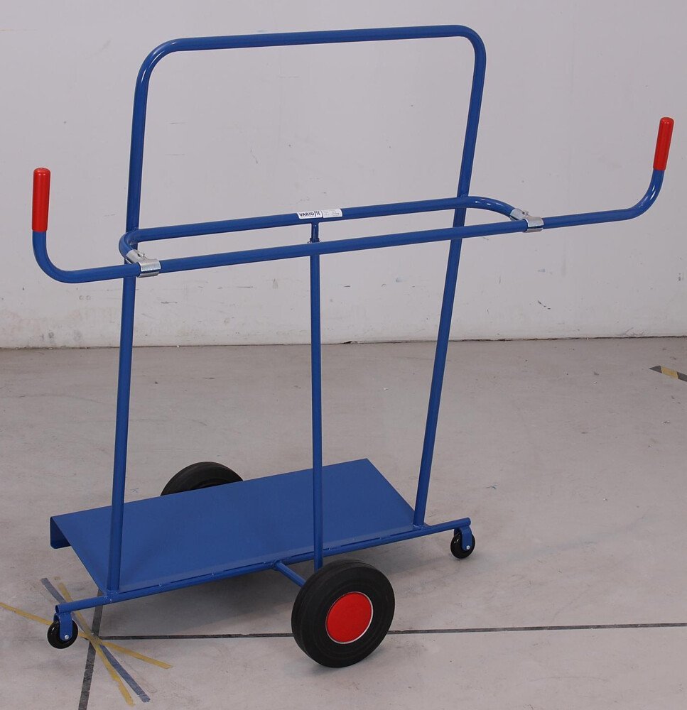 Vozík na doskový materiál nemeckej výroby, zváraná oceľová konštrukcia, protišmyková ložná plocha z vodeodolnej preglejky. Vozík je veľmi dobre ovládateľný. Farba modrá RAL 5007. 4 špeciálne pneumatické kolieska Fetra TPE, z toho 2 otočné s brzdou, 2 pevné