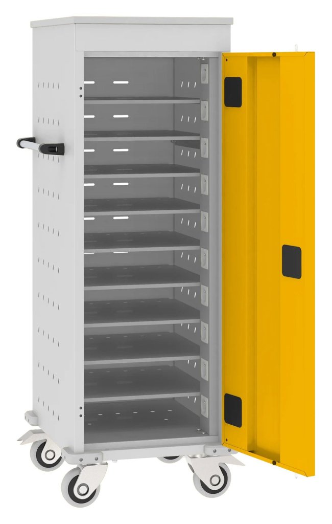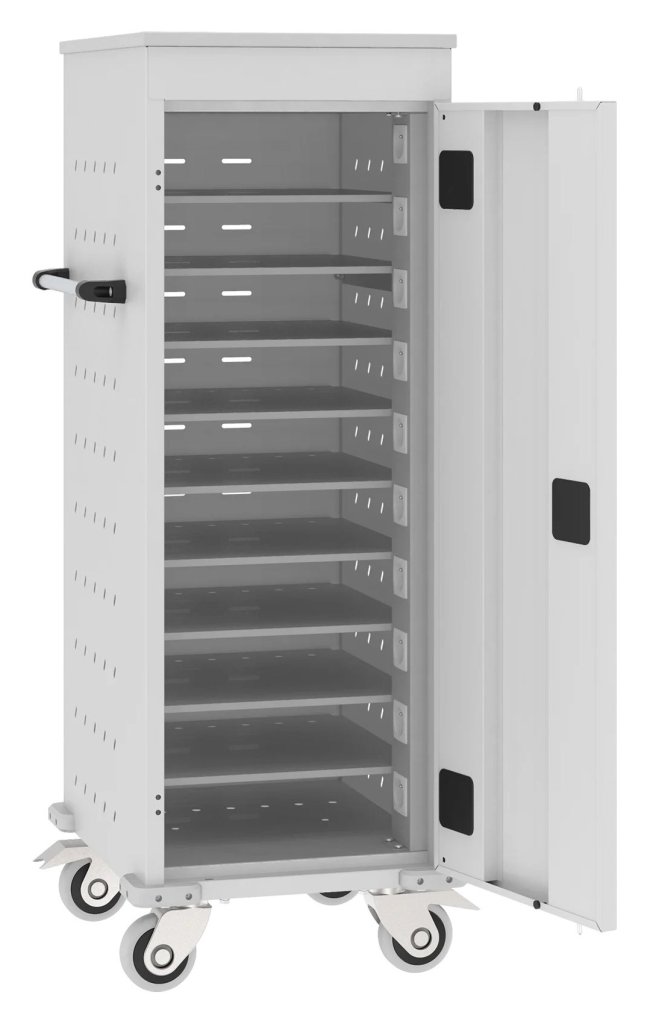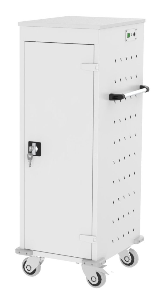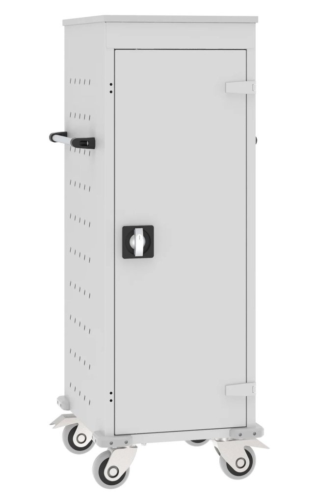 Vozík s funkciou nabíjania batérie na uloženie a jednoduchý transport notebookov. Ideálne pre školy, knižnice, konferenčné haly a iné. Rozmery v mm (V x Š x H) 1250 x 530 x 540.