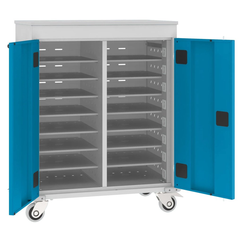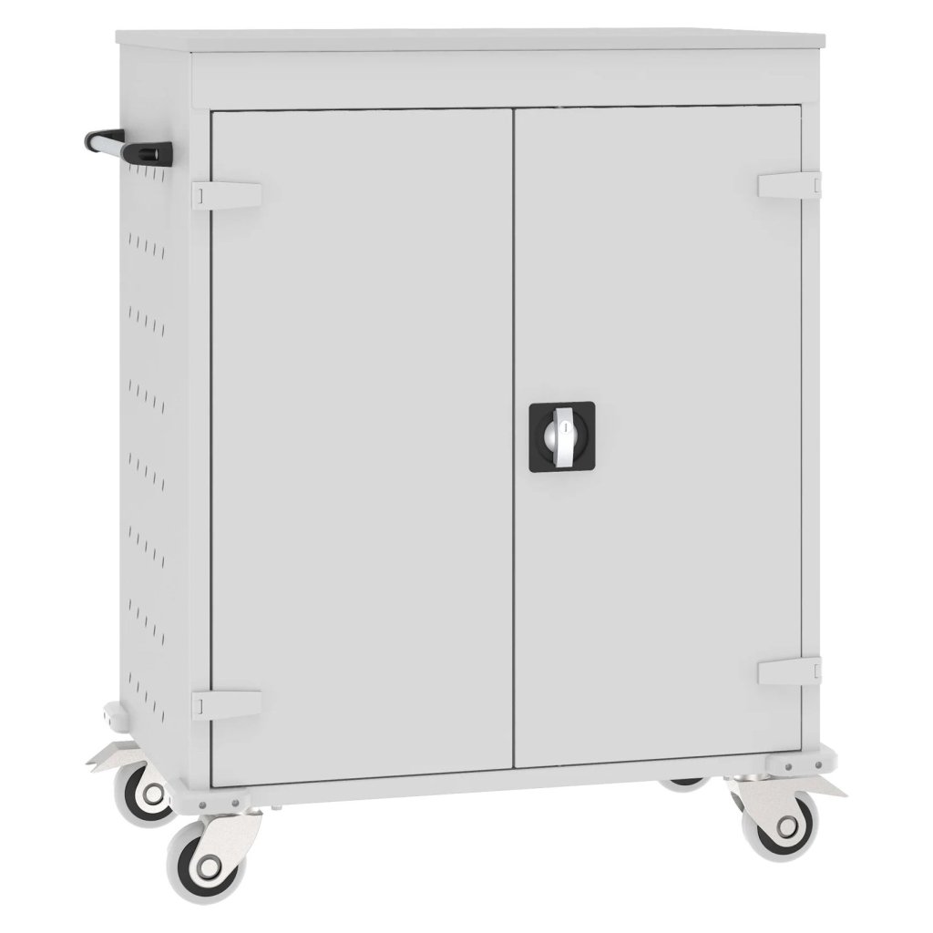 Vozík s funkciou nabíjania batérie na uloženie a jednoduchý transport notebookov. Ideálne pre školy, knižnice, konferenčné haly a iné. Rozmery v mm (V x Š x H) 1060 x 920 x 540.