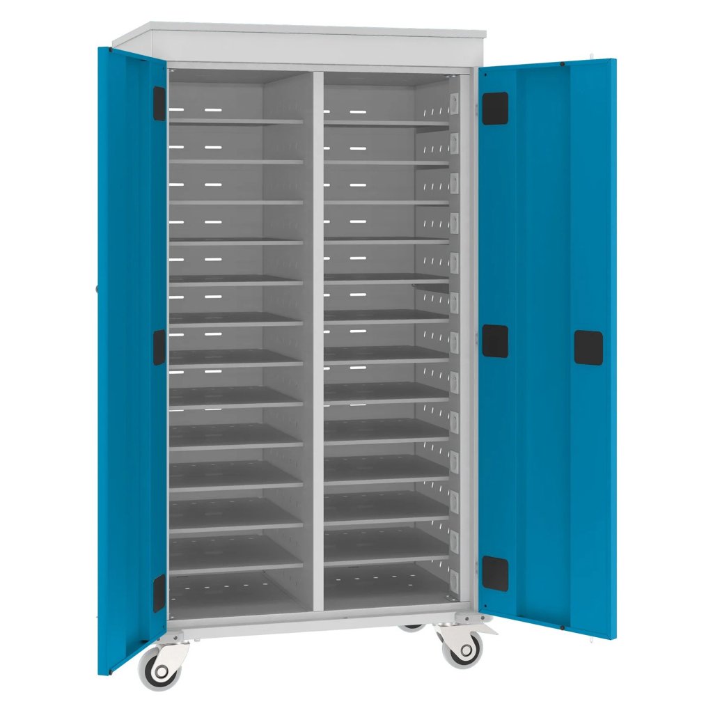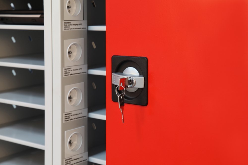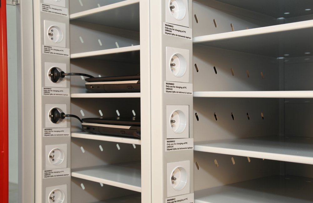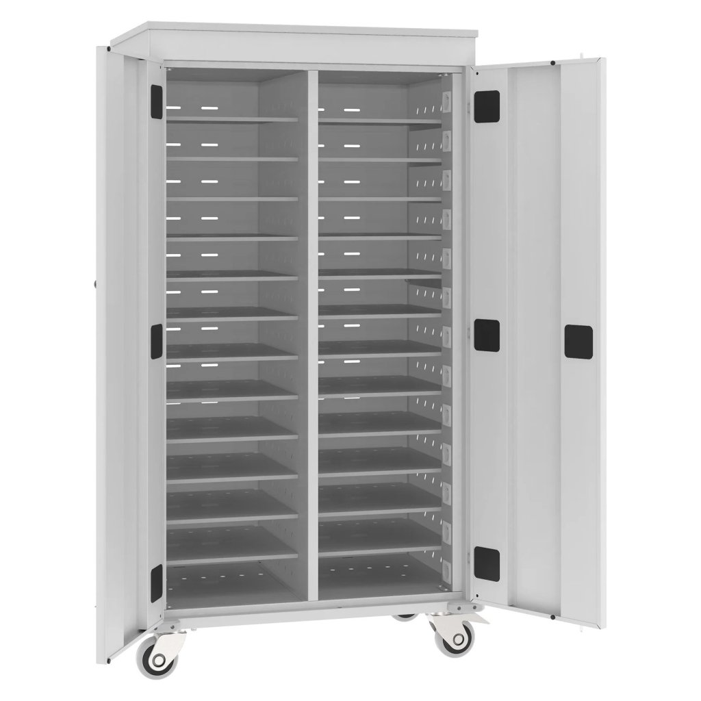 Vozík s funkciou nabíjania batérie na uloženie a jednoduchý transport notebookov. Ideálne pre školy, knižnice, konferenčné haly a iné. Rozmery v mm (V x Š x H) 1540 x 920 x 540.
