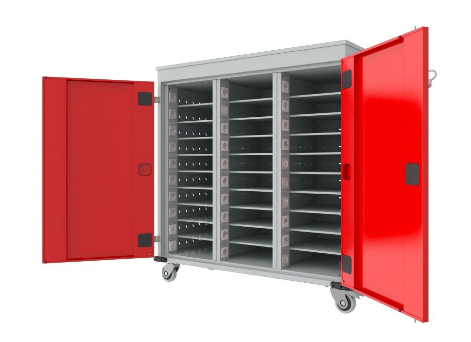 Vozík s funkciou nabíjania batérie na uloženie a jednoduchý transport notebookov. Ideálne pre školy, knižnice, konferenčné haly a iné. Rozmery v mm (V x Š x H) 1250 x 1310 x 540.