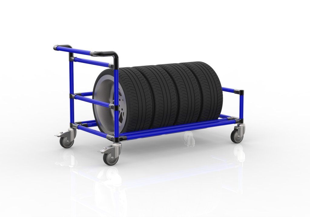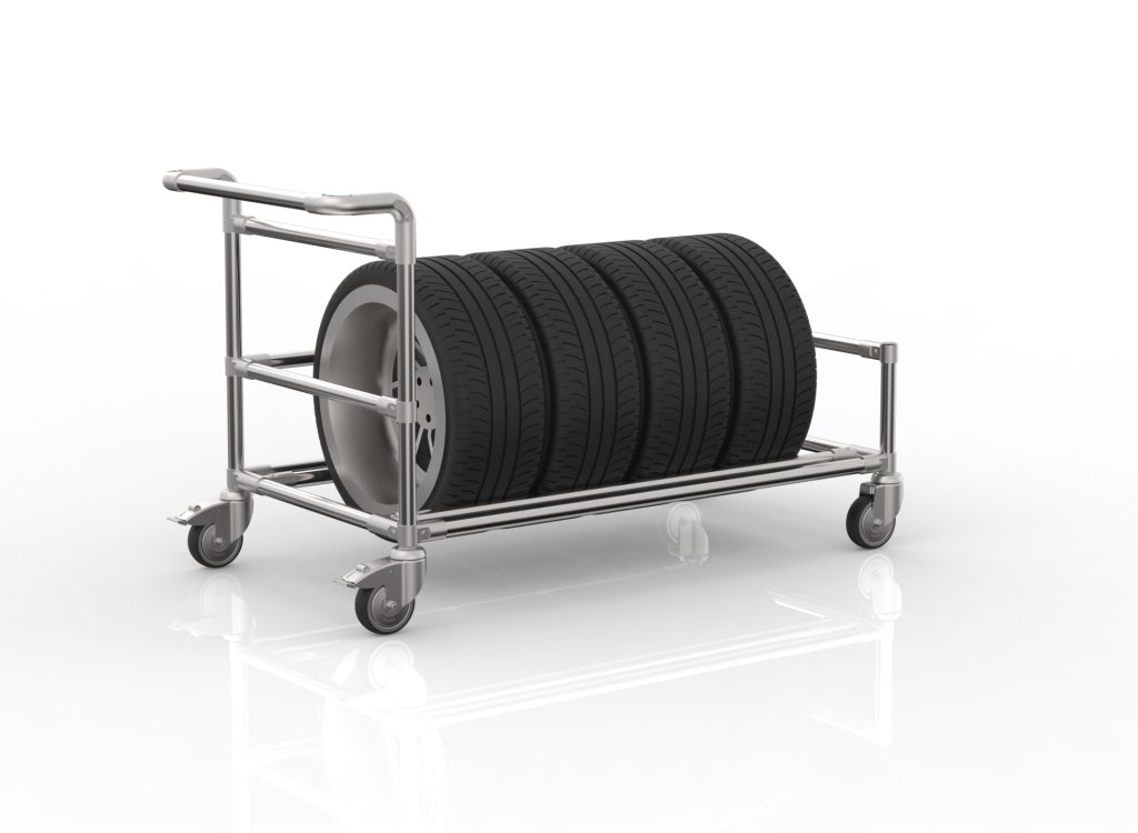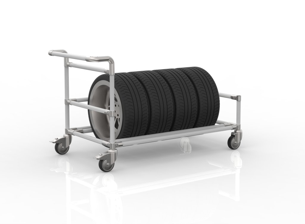Vozík na pneumatiky s policou vyrobený z rúrkového stavebnicového systému. Ideálny pre rozmery pneumatík 16" až 20". Súčasťou vozíka je polica s doskou z akyboardu hrúbky 10 mm, dve praktické madlá, dve otočné kolieska s brzdou a dve otočné kolieska bez brzdy s priemerom 100 mm, ktoré umožňujú jednoduchú manipuláciu. Pneumatiky nie sú súčasťou. Nosnosť police je 75 kg, celková nosnosť vozíka je 175 kg. Rozmery: 850 x 1200 x 433 mm.