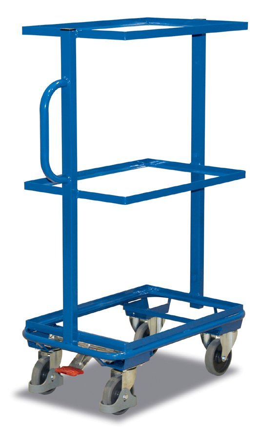 Vozík na prepravu Euro prepraviek. Zváraná oceľová konštrukcia, 3 otvorené police. Sklon 17 ° alebo 32 °. Povrchová úprava práškovým lakom 5010 modrá. 4 otočné kolieska s ochranou na nohy, z nich 2 s brzdou. Rozmery: výška 1125 x šírka 935 x hĺbka 665 mm. Ložná plocha 825 x 604 mm.