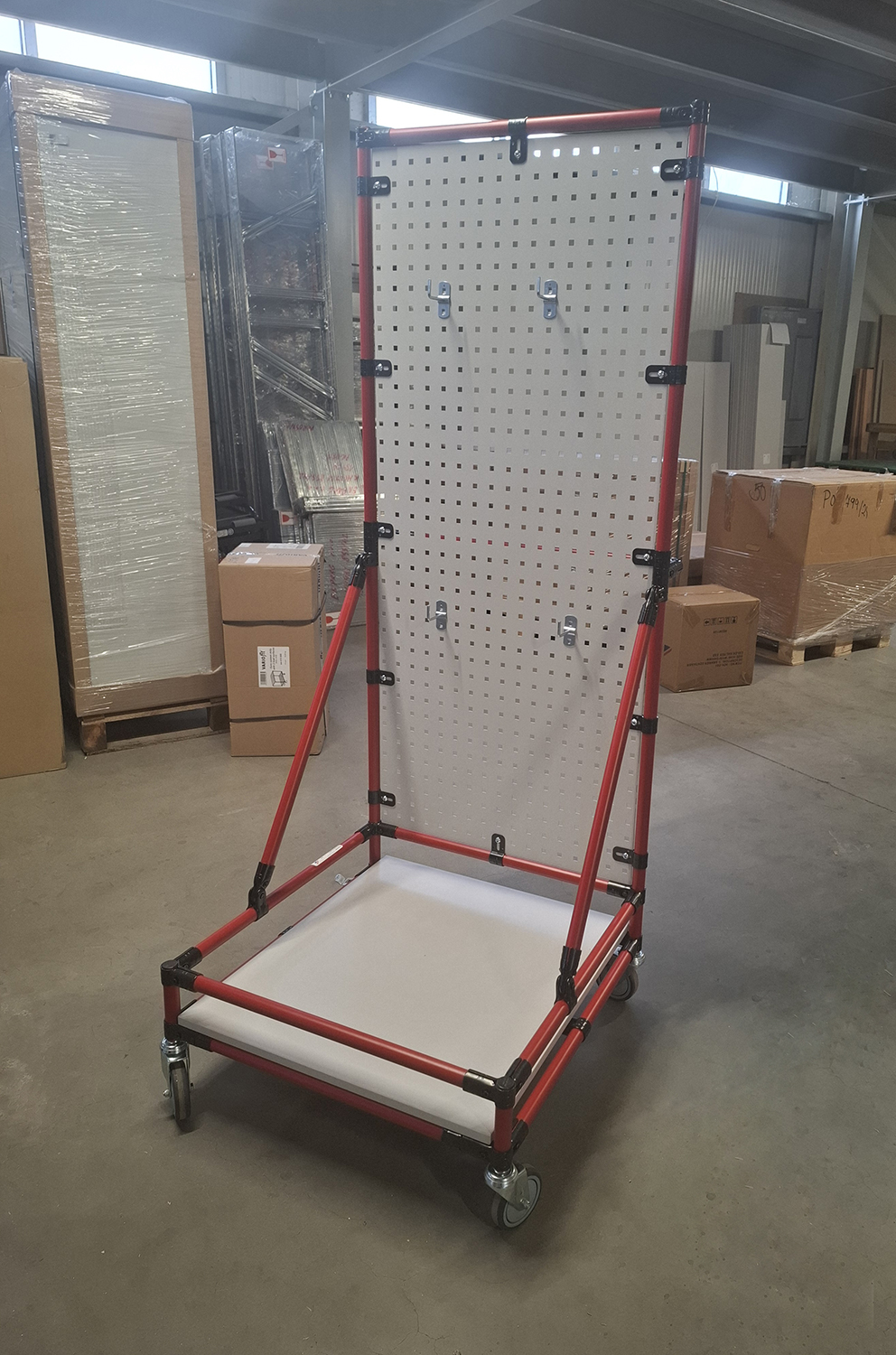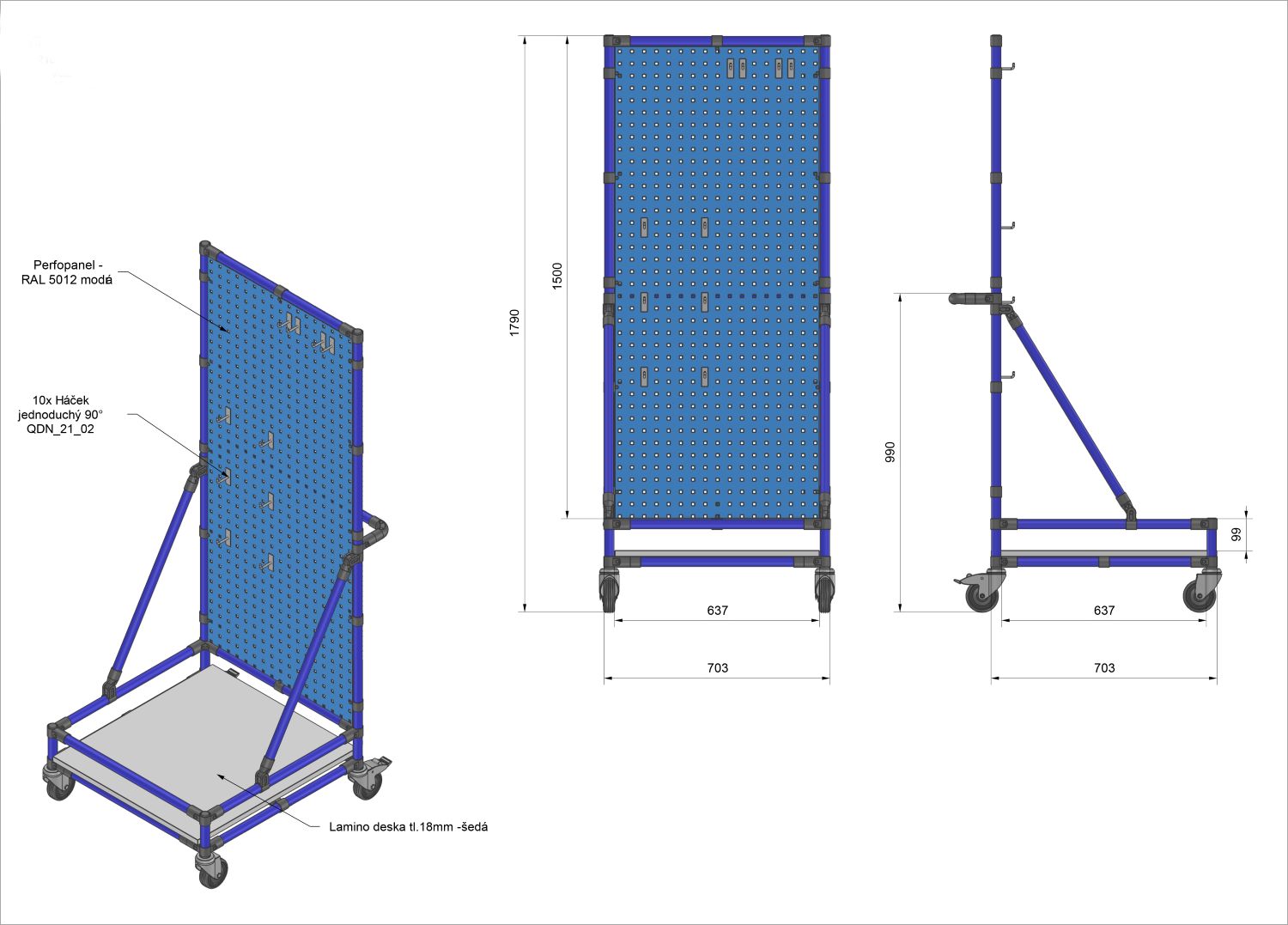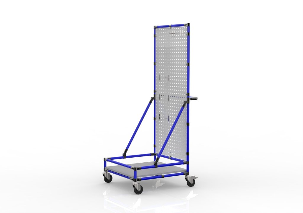 Vozík na upratovanie na dodržanie metodiky 5S. Vhodný pre organizáciu a upratovanie na pracovisku. Súčasťou je perfopanel s 10 háčikmi a lamino doskou hrúbky 18 mm. Konštrukcia tvorená rúrkami LP-1100, modrá. Spojky ošetrené čiernym práškovým lakom.
