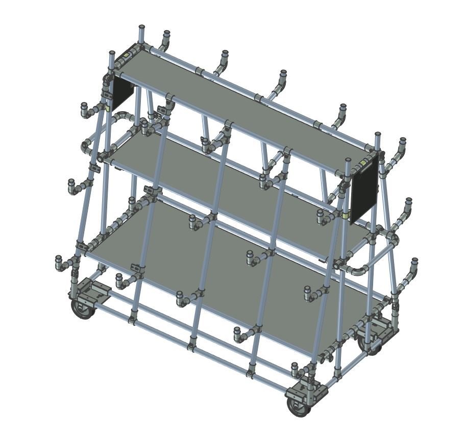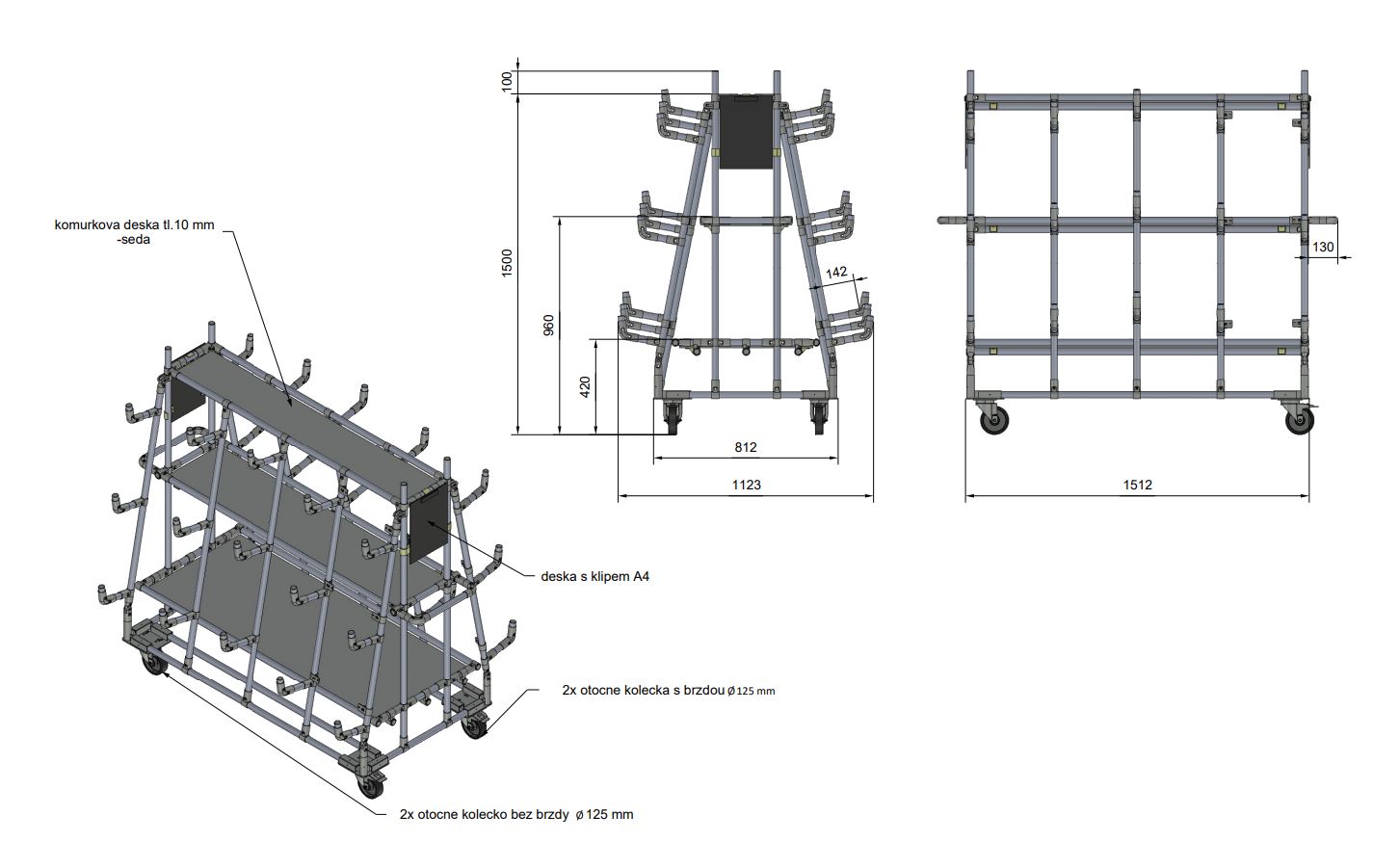 Vychystávací vozík na prepravu produktov. Súčasťou je doska s klipom A4, 2x otočné koliesko s brzdou s priemerom 125 mm a 2x otočné koliesko bez brzdy 125 mm.