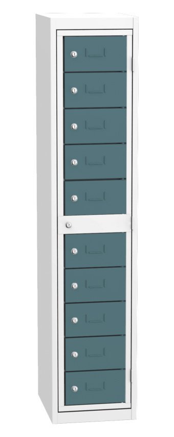 Skriňa pre výdaj čistých pracovných odevov, šírka 380, výška 1770, hĺbka 460 mm. Obsahuje desať výdajných boxov a jeden centrálny rám pre obsluhu. Každá výdajná schránka a centrálny rám pre obsluhu sú uzamykateľné cylindrickým zámkom. Farba korpusu RAL 7035 svetlosivá.