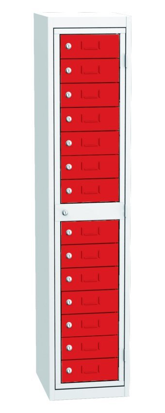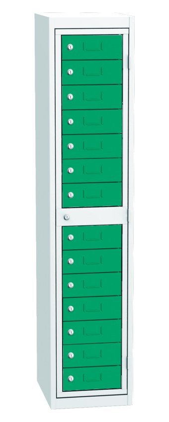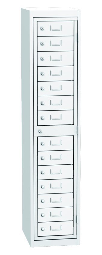 Skriňa pre výdaj čistých pracovných odevov, šírka 420, výška 1980, hĺbka 500 mm. Obsahuje dvanásť výdajných boxov a jeden centrálny rám pre obsluhu. Každá výdajná schránka a centrálny rám pre obsluhu sú uzamykateľné cylindrickým zámkom. Farba korpusu RAL 7035 svetlosivá.
