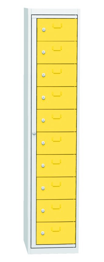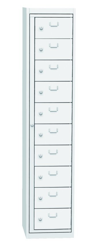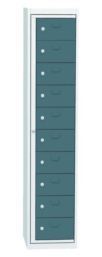 Skriňa pre výdaj čistých pracovných odevov, šírka 380, výška 1770, hĺbka 460 mm. Obsahuje desať výdajných boxov a jeden centrálny rám pre obsluhu. Každá výdajná schránka a centrálny rám pre obsluhu sú uzamykateľné cylindrickým zámkom. Farba korpusu RAL 7035 svetlosivá.