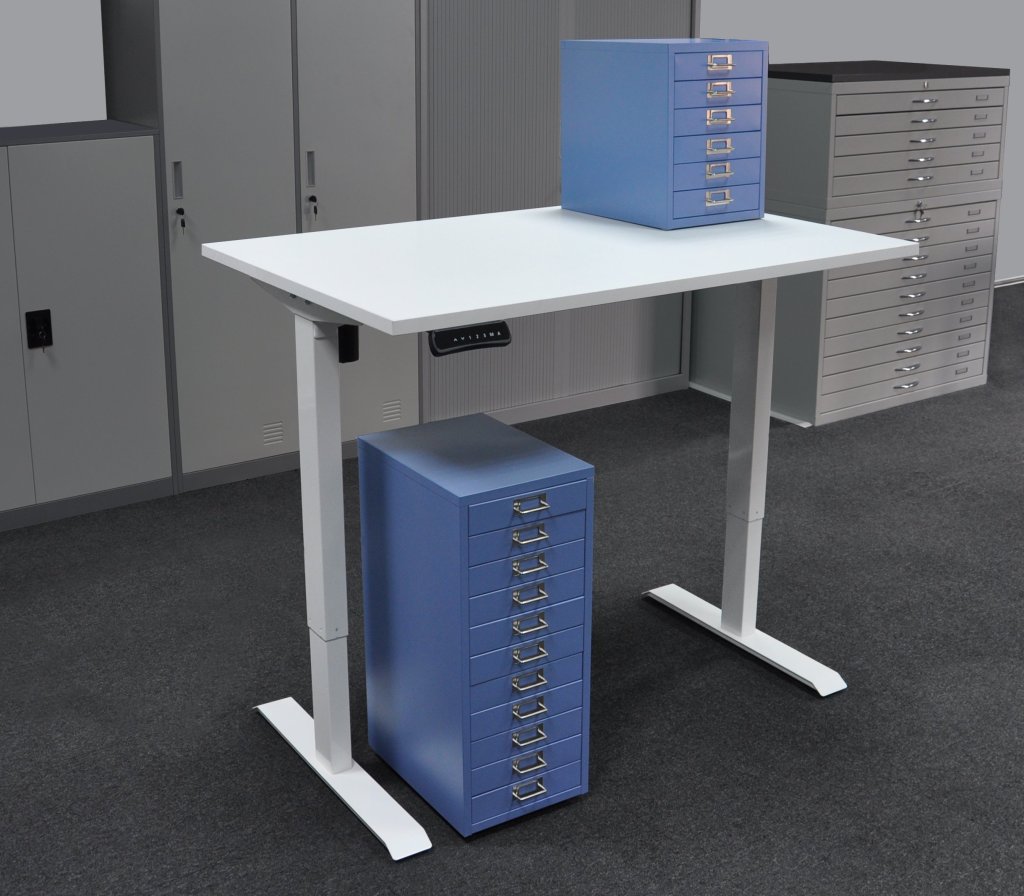 Elektricky výškovo nastaviteľný stôl so zásuvkovými skriňami. Celkom 11 zásuviek zaisťujúcich dostatok úložného priestoru. Rozmedzie nastavenia výšky pracovnej dosky stola 735 – 1235 mm. Hĺbka dosky stola 800 mm. Stôl umožňuje prácu v stoji aj v sede a zamedzuje tak bolestiam chrbta pri dlhodobom sedení. Na výber niekoľko dezénov pracovných dosiek, podnož biela.