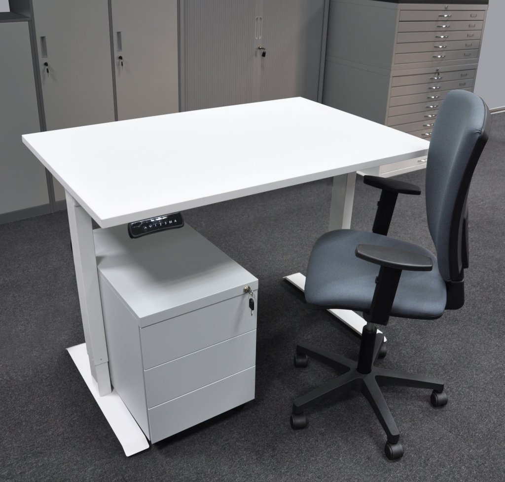 Elektricky výškovo nastaviteľný stôl s trojzásuvkovým kontajnerom a stoličkou. Nosnosť stoličky 120 kg. Rozmedzie nastavenia výšky pracovnej dosky 735 – 1235 mm. Hĺbka dosky stola 800 mm. Stôl umožňuje prácu v stoji aj v sede a zamedzuje tak bolestiam chrbta pri dlhodobom sedení. Na výber niekoľko dezénov pracovných dosiek, podnož biela.