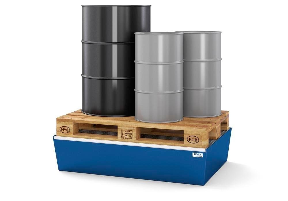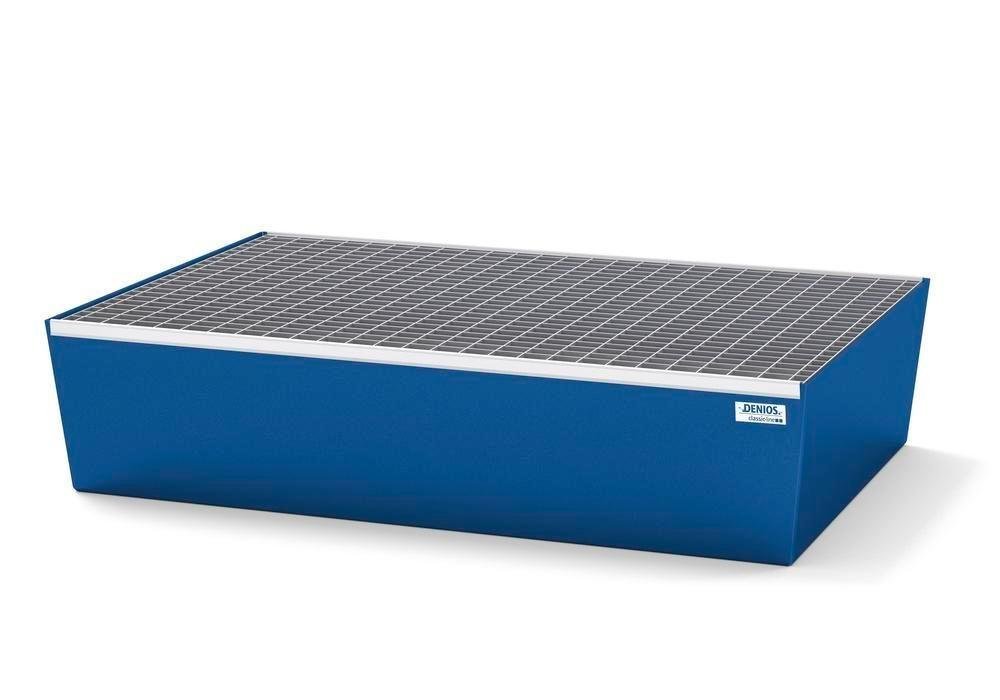 Záchytná vaňa classic-line zo zvárané oceľové konštrukcie. Schválené pre skladovanie horľavých kvapalín (H224-226) a vodu ohrozujúcich látok všetkých tried. Ochrana pred koróziou vďaka vysoko kvalitnému práškovému lakovanie vo farbe modrej RAL 5010. Bez nožičiek, na skladovanie priamo na rovnej podlahe alebo na paletách. Vyberateľný zinkovaný rošt.