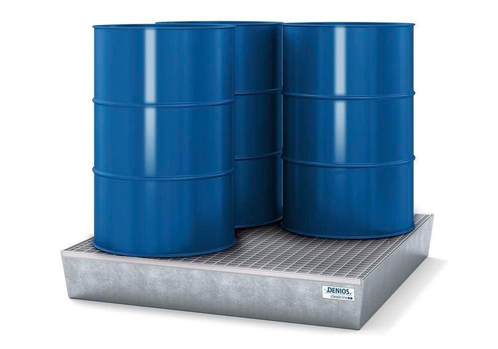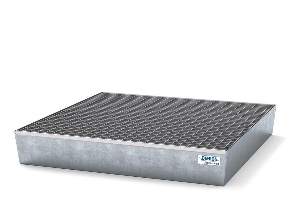 Záchytná vaňa classic-line zo zvárané oceľové konštrukcie. Schválené pre skladovanie horľavých kvapalín (H224-226) a vodu ohrozujúcich látok všetkých tried. Zinkované pre optimálnu ochranu proti korózii. Bez nožičiek, na skladovanie priamo na rovnej podlahe alebo na paletách. Vyberateľný zinkovaný rošt.
