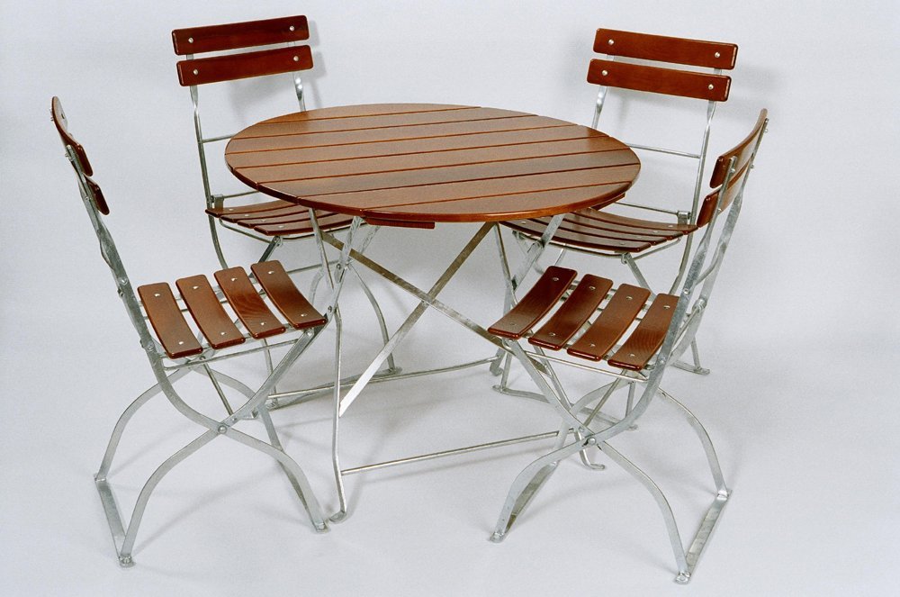 - stoličky a stôl sú skladacie a drevo je ku kovovému skeletu priskrutkované pozinkovanými vratovými skrutky