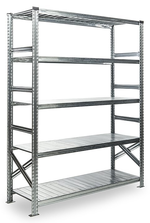 Bezskrutkový základný regál SUPER, prevedenie pozink. Výška 1576 mm, šírka police 600 mm, hĺbka police 400 mm. Nosnosť 200 kg. 5 políc. Možnosť nastavovania přístavnými regálmi do nekonečných dĺžok (pozri Môžete si dokúpiť).