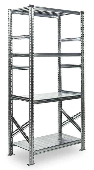 Základný regál CLIP, prevedenie pozinok, hĺbka 400 mm, výška 2000 mm, šírka 1300 mm, 4x polica. Bezskrutkový, ľahká montáž. Možnosť nastavovania prístavnými regálmi do nekonečných dĺžok (pozri K dokúpeniu). Základný regál obsahuje zavetrovací kríž. Nosnosť police 230 kg.