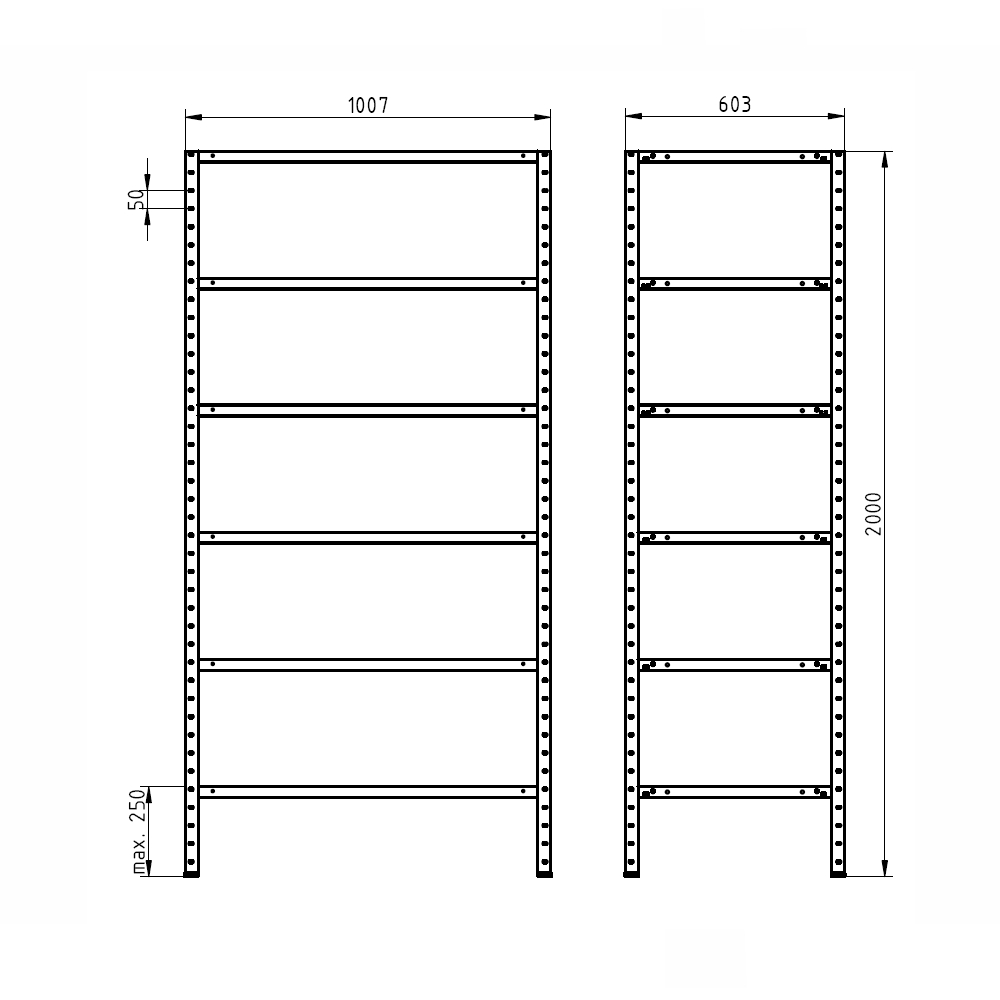 Kovový skrutkový regál určený k širokému použitiu v skladoch, archívoch, garážach, kanceláriách a iných úložných priestoroch. Výška 2000 mm, šírka 1000 mm, hĺbka 500 mm, 6 políc. Nosnosť police je stanovená na maximálne rovnomerné zaťaženie 250 kg a slúži na ukladanie ťažkých predmetov. Jednoduchá montáž pomocou skrutkových spojov.